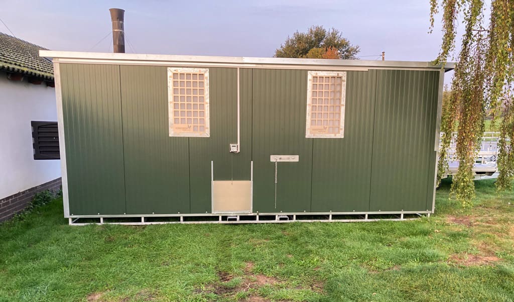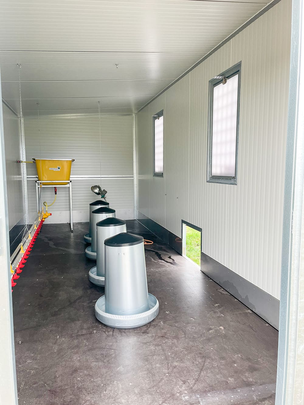 Unser Mastcontainer bietet Platz für ca. 150 – 180 Hähnchen. Der Container ist mit vier Futterbehältern (je 40 kg Fassungsvermögen), einem Wasserbehälter (180 Liter) und einem Nippeltränkenstrang ausgestattet. Optional können Sie sich zusätzlich für eine PV-Anlage, einen Gasstrahler oder einen Lüfter entscheiden.
