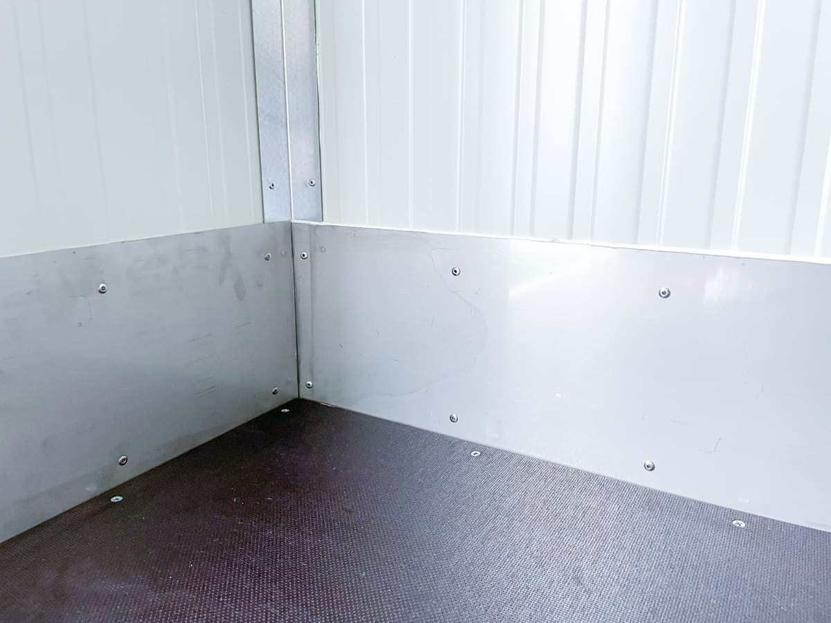 Im Inneren des Mastcontainers sind nur leicht zu reinigende und hygienische Materialien verbaut. Das Innere besteht hauptsächlich aus Metall und Kunststoff. Schädlinge wie zum Beispiel die Milbe haben somit keine Chance sich in dem Stall dauerhaft anzusiedeln. Die Wände besitzen angrenzend am Boden einen umlaufenden Edelstahlsockel.