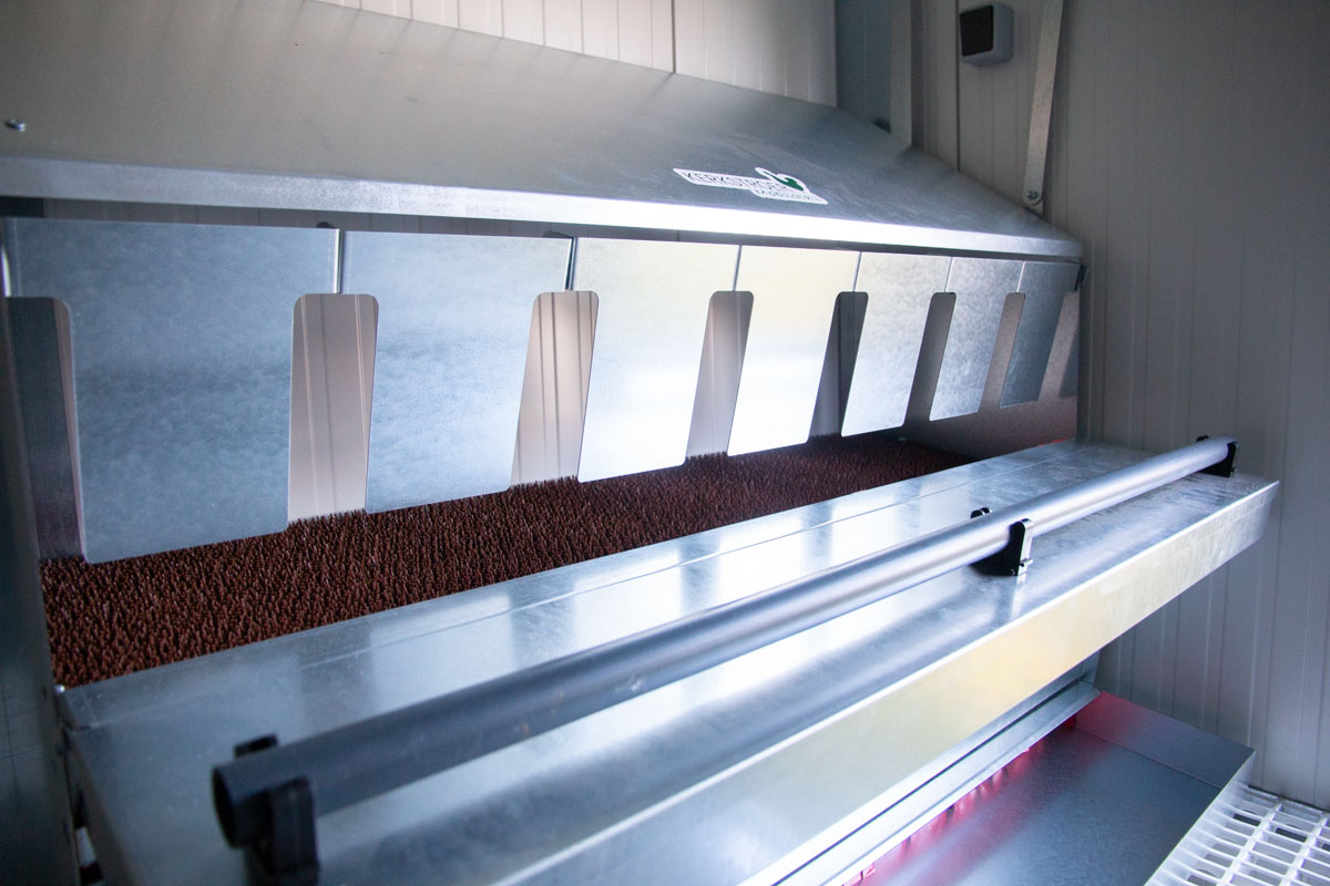 Hier wird trockenes Einstreu eingelegt. Der Kot im Scharraum ist trocken und lässt sich leicht ausfegen.