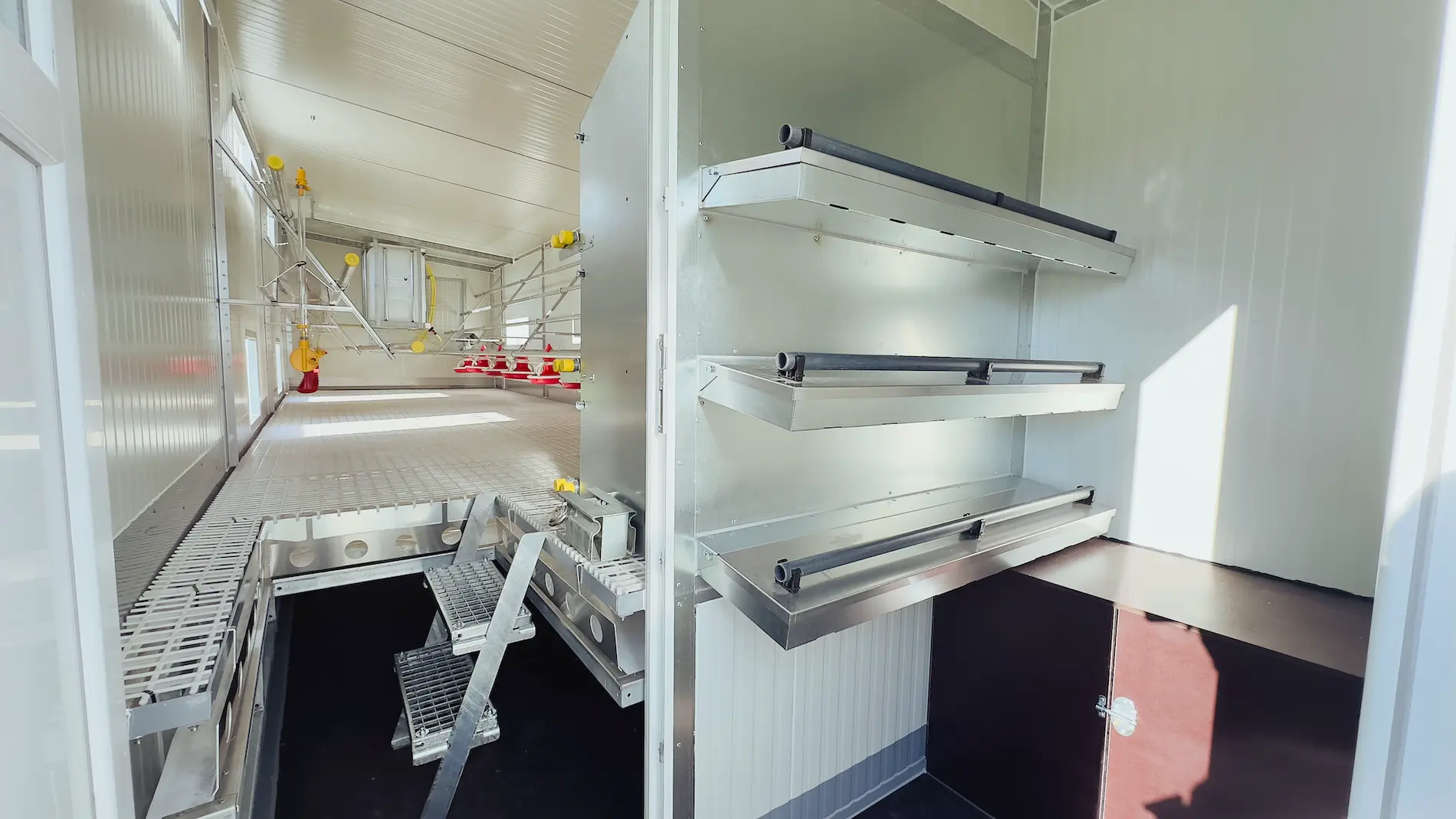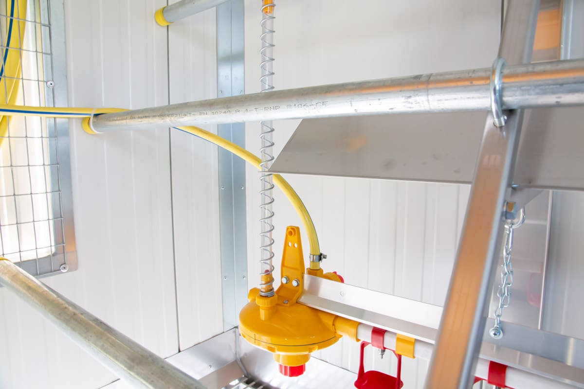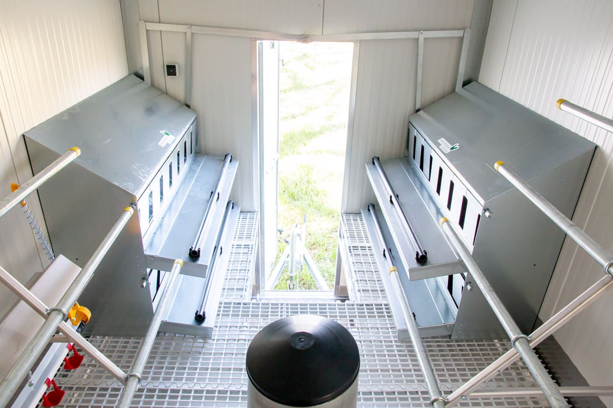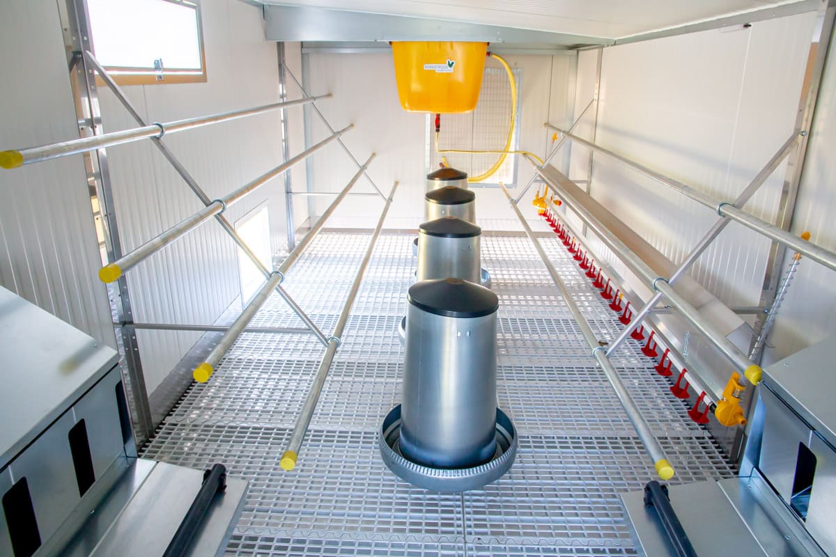 Der mobile Hühnerstall wird mit einem vollautomatischen Fütterungssystem ausgestattet. Das System versorgt die Tiere zuverlässig und gleichmäßig mit Futter, auch über mehrere Tage hinweg.