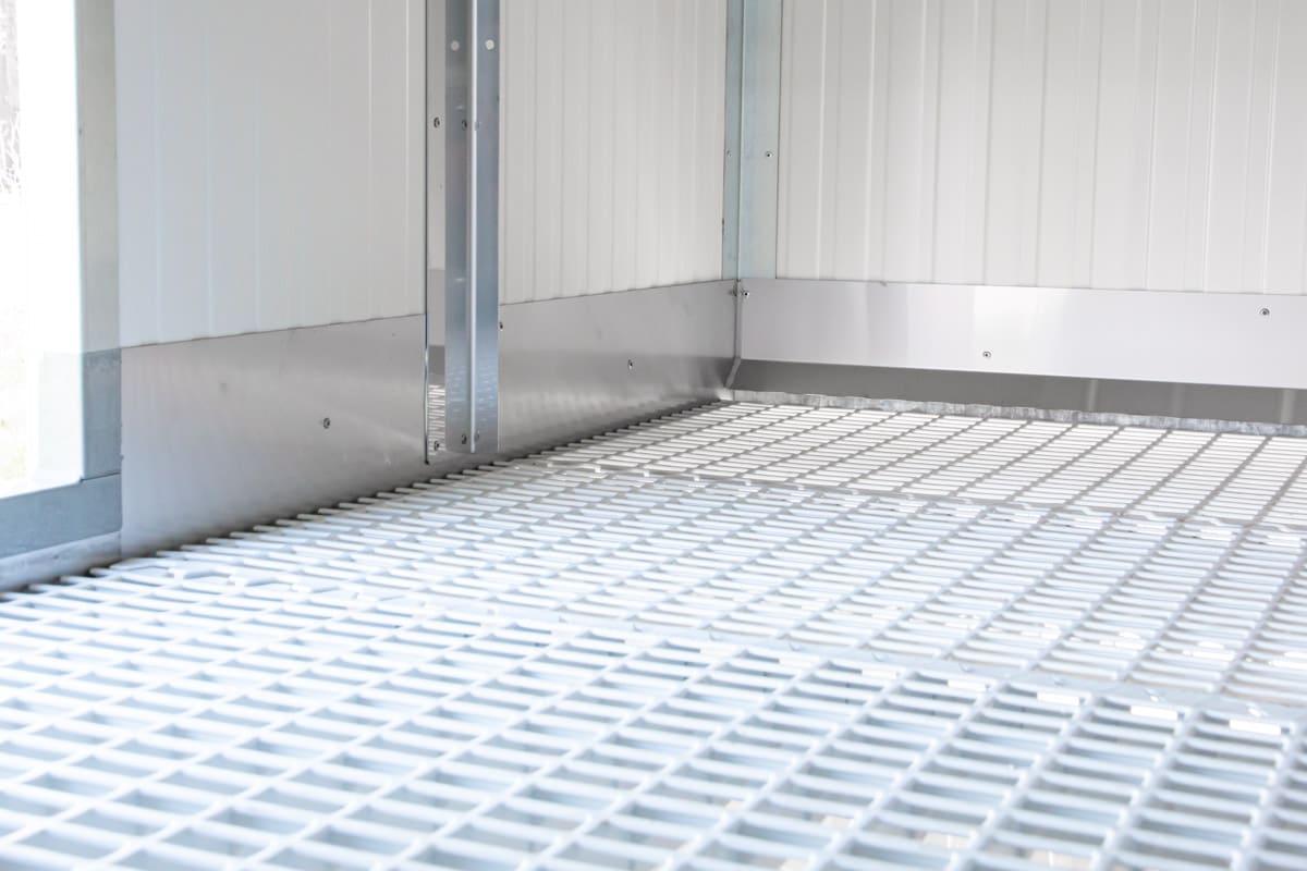 Im Inneren des Mobilstalls sind nur leicht zu reinigende und hygienische Materialien verbaut. Das Innere besteht hauptsächlich aus Metall und Kunststoff. Schädlinge wie zum Beispiel die Milbe haben somit keine Chance sich in dem Stall dauerhaft anzusiedeln. Der Boden des Scharraums besteht aus einer wasserfesten Siebdruckplatte mit umlaufenden Edelstahlsockel.