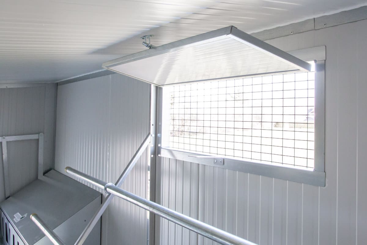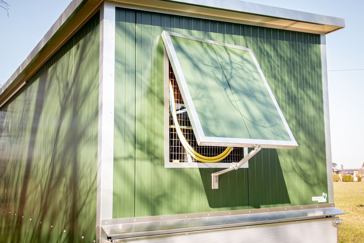 Außerdem besitzt der Mobilstall 4 manuelle Belüftungsklappen die gleichzeitig als Lichtluken dienen. Die große Luke auf der Rückseite sowie die Eingangstür auf der Vorderseite sind aus Doppelstegplatten gefertigt, somit ist die Anforderung an vorgeschriebener Tageslichtfläche großzügig erfüllt. Die Fensterluke mit dem zusätzlichen Gitterschutz kann wie alle anderen Luken stufenweise geöffnet werden.