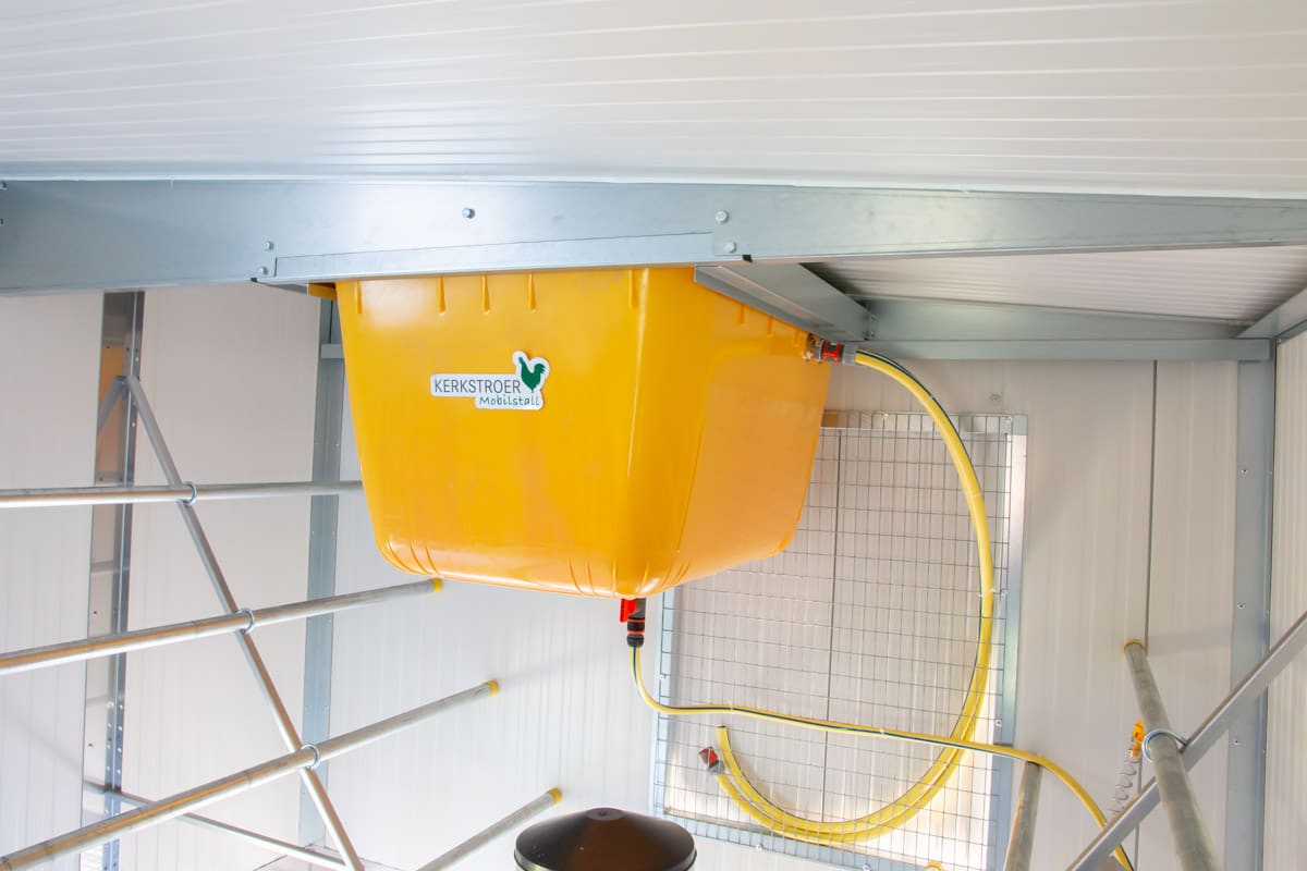 Der Mobilstall 180 ist mit einem 180 L Tank für Frischwasser ausgestattet. Der Wasserbehälter befindet sich unter dem Dach. Wenn Sie den Sicherheitsbügel lösen, können Sie den Behälter uneingeschränkt einsehen und bei Bedarf reinigen. Somit haben Sie immer eine optische Kontrolle über Füllmenge und Wasserqualität. Der Druck bei den Trinknippeln kann durch den Druckminderer reguliert werden.