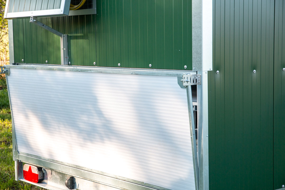 Außerdem besitzt der Mobilstall 4 manuelle Belüftungsklappen die gleichzeitig als Lichtluken dienen. Die große Luke auf der Rückseite sowie die Eingangstür auf der Vorderseite sind aus Doppelstegplatten gefertigt, somit ist die Anforderung an vorgeschriebener Tageslichtfläche großzügig erfüllt. Die Fensterluke mit dem zusätzlichen Gitterschutz kann wie alle anderen Luken stufenweise geöffnet werden.