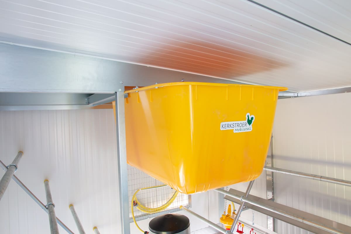Der mobile Hühnerstall wird mit einem vollautomatischen Fütterungssystem ausgestattet. Das System versorgt die Tiere zuverlässig und gleichmäßig mit Futter, auch über mehrere Tage hinweg.