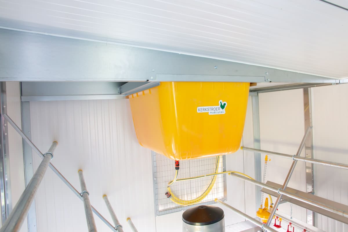 Der Mobilstall 210 ist mit einem 180 L Tank für Frischwasser ausgestattet. Der Wasserbehälter befindet sich unter dem Dach. Wenn Sie den Sicherheitsbügel lösen, können Sie den Behälter uneingeschränkt einsehen und bei Bedarf reinigen. Somit haben Sie immer eine optische Kontrolle über Füllmenge und Wasserqualität. Der Druck bei den Trinknippeln kann durch den Druckminderer reguliert werden.