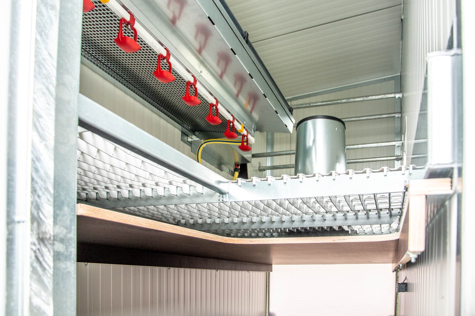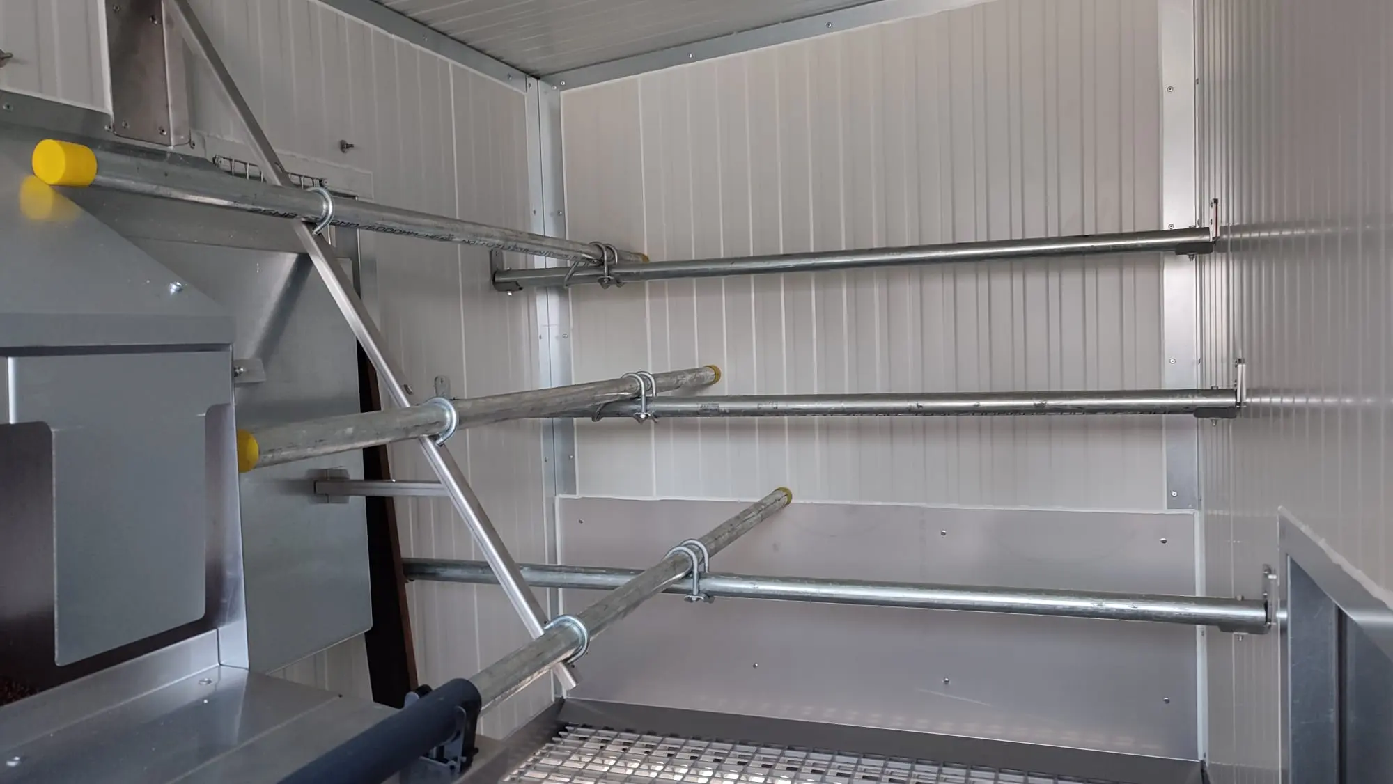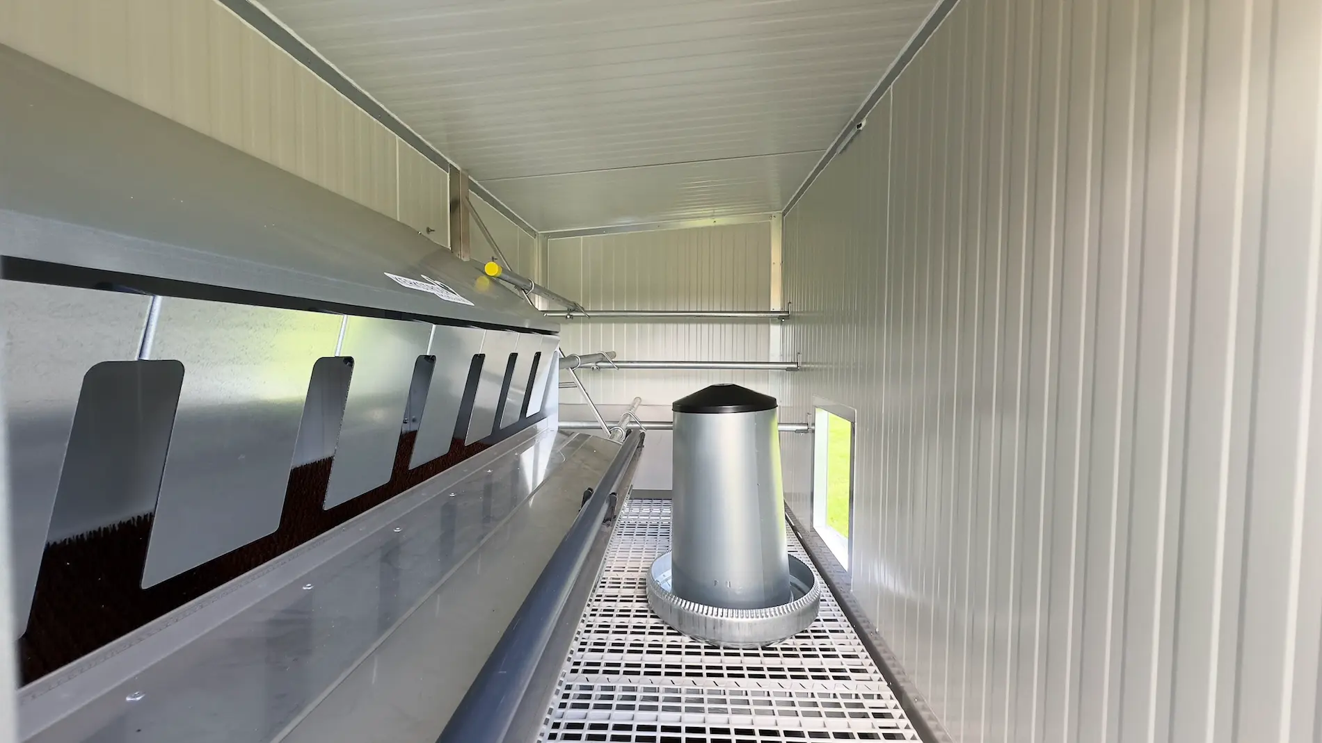 Die Wände und die Decke bestehen aus vollisolierten Sandwichplatten. Diese Platten werden eigentlich für den Bau von Industriehallen benötigt. Dadurch bleibt das Stallklima im Sommer sowie im Winter für die Hühner angenehm.