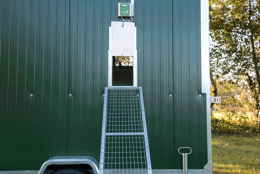 Der Mobilstall lässt sich sehr schnell an eine neue Stelle versetzen. Nehmen Sie hierfür einfach die kleine Hühnerleiter ab, klappen Sie die beiden Stützen hoch, koppeln Sie den Mobilstall an ein geeignetes Fahrzeug an und ziehen Sie den Anhänger an die gewünschte Stelle. Das dauert bei etwas Übung keine 5 Minuten.