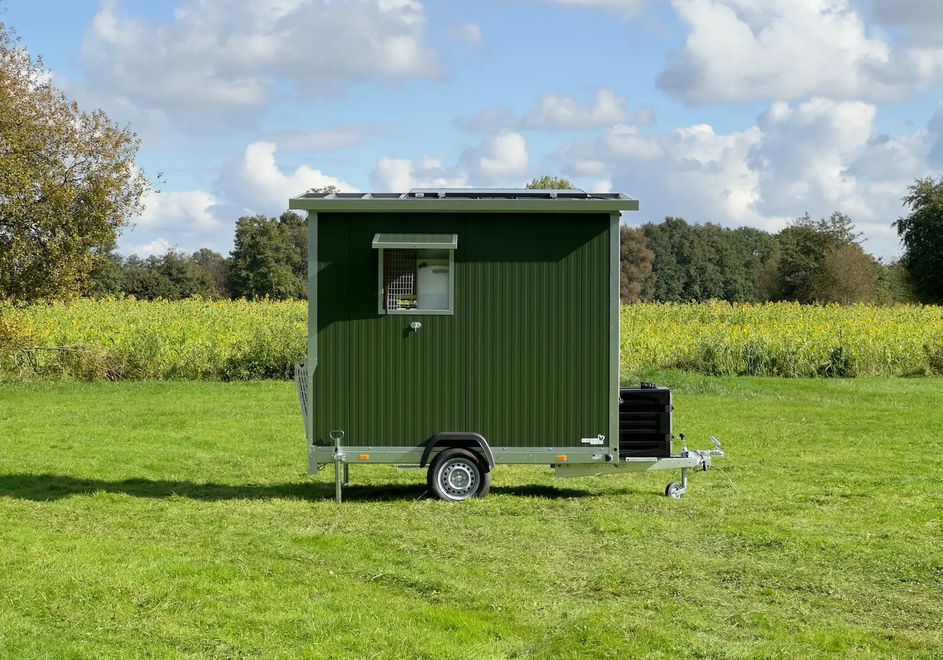Optional bieten wir Ihnen den Mobilstall 52 mit einer (320 W) PV-Anlage und der passenden Solar-Batterie an. Somit ist der Mobilstall autark und Sie müssen keine Stromkabel verlegen.