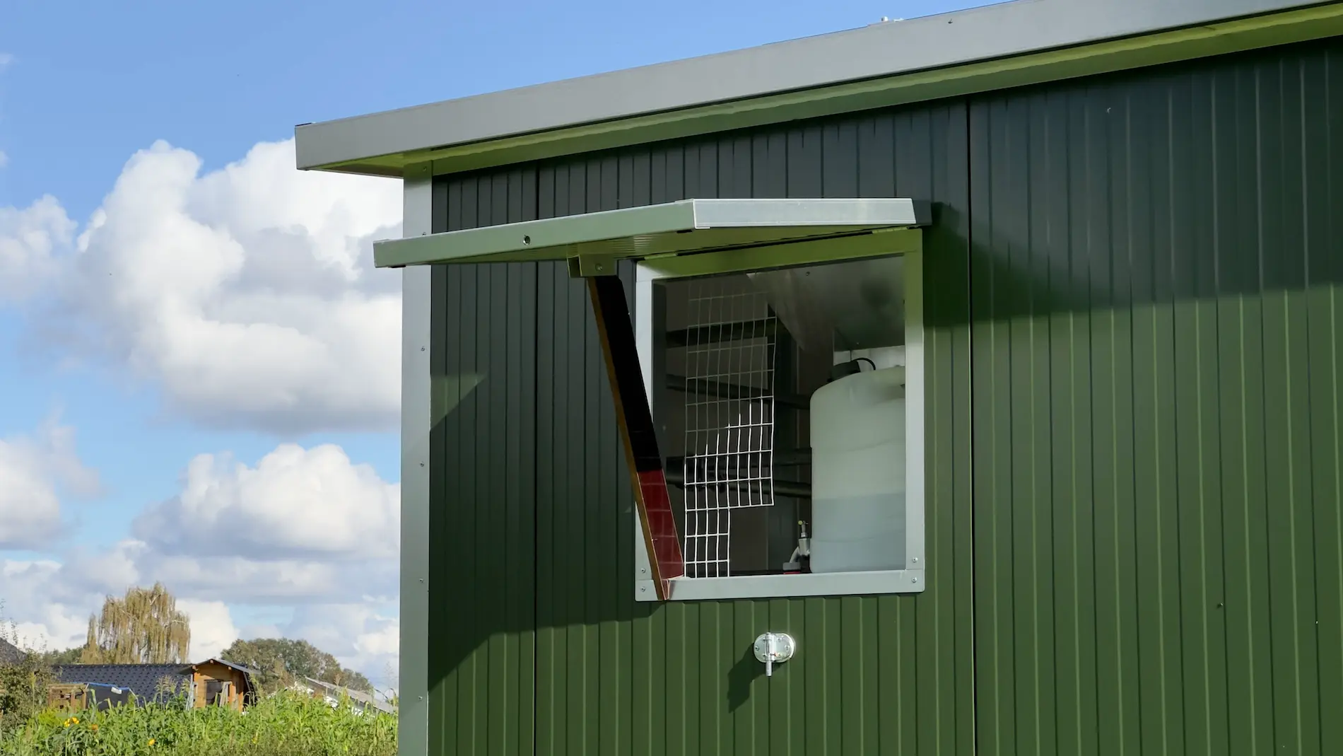 Der Mobilstall 52 ist mit einem 20 L Tank für Frischwasser ausgestattet. Sie können den Wasserbehälter uneingeschränkt einsehen, somit haben Sie immer eine optische Kontrolle über Füllmenge und Wasserqualität. Der Wasserbehälter lässt sich zur Reinigung und Befüllung einfach entnehmen.