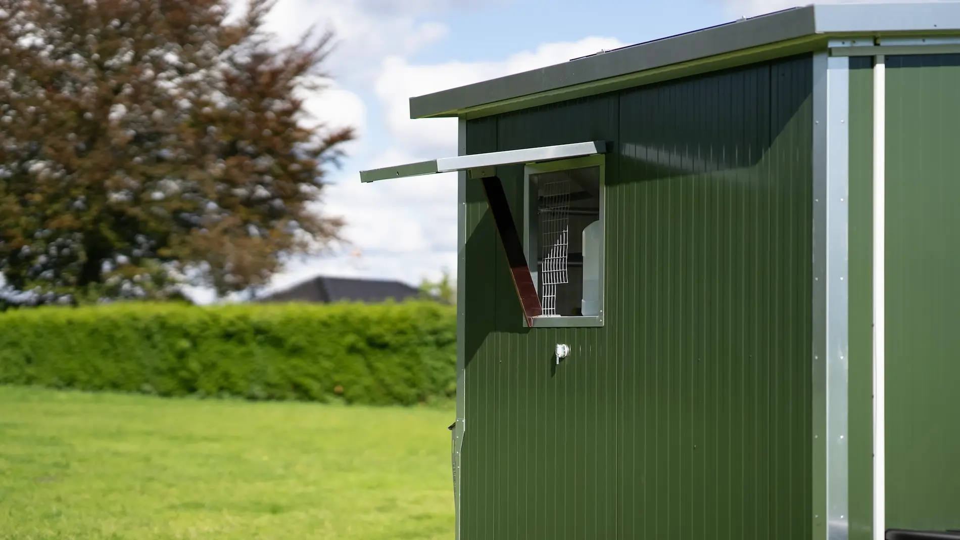 Außerdem besitzt der Mobilstall 3 manuelle Belüftungsklappen die gleichzeitig als Lichtluken dienen. Die große Luke auf der Rückseite sowie die Eingangstür auf der Vorderseite sind aus Doppelstegplatten gefertigt, somit ist die Anforderung an vorgeschriebener Tageslichtfläche großzügig erfüllt.