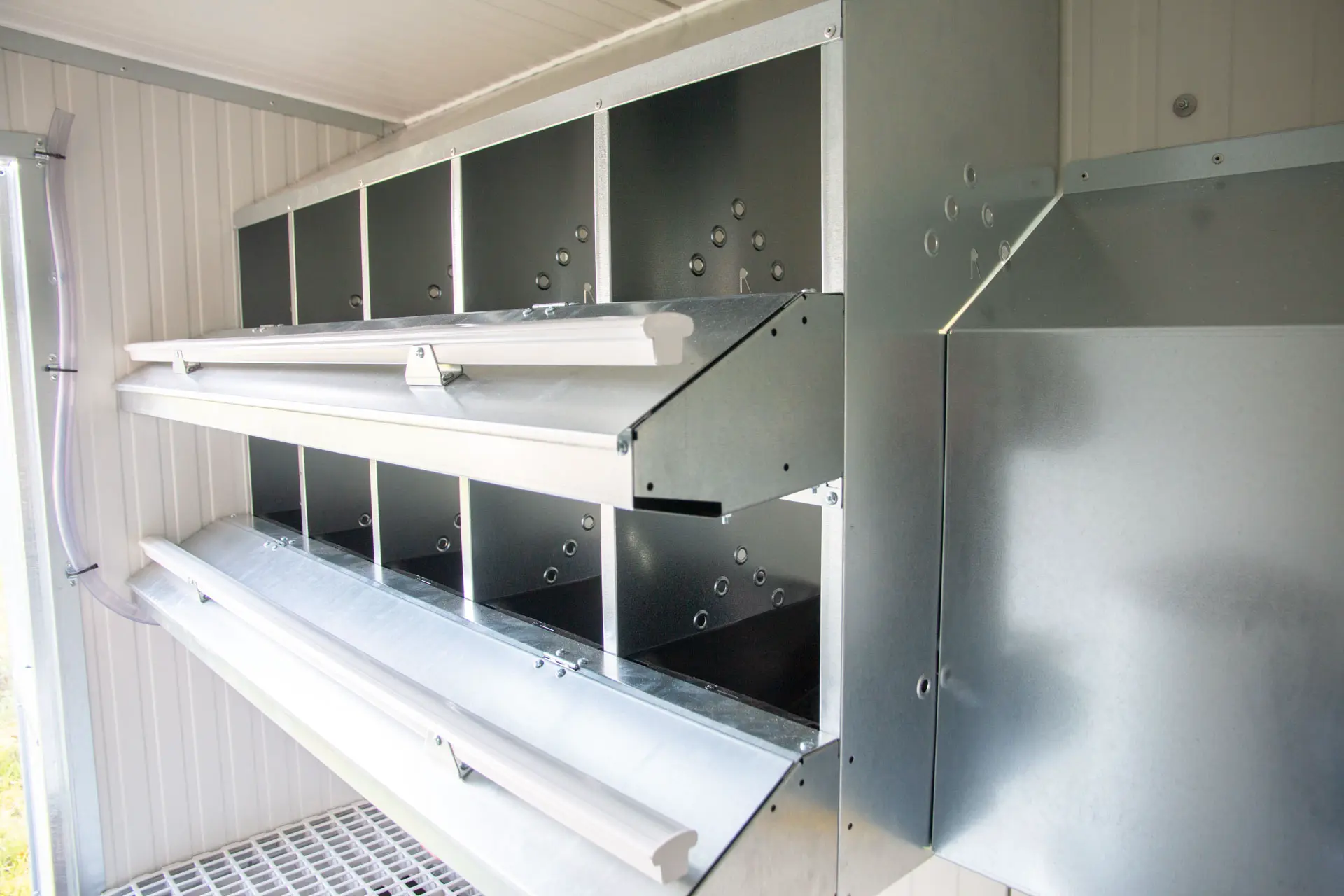 Auf der oberen Ebene befinden sich 7,2 m Sitzstangen, der Futterbehälter, der Wasserbehälter, die Trinknippel, das 10er-Einzelnest und die Hühnerklappe. Direkt unter der oberen Ebene befindet sich die Kotschublade.